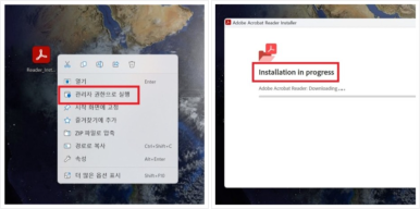 이어서 준비된 파일을 찾아 관리자 권한 실행을 선택해 보도록 하겠다. 현재 사용 중인 컴퓨터에서 누구나 쉽고 간단히 뷰어를 다운받고 설치할 수 있다. 평소에 .pdf 파일 형태를 많이 사용한다면 미리 설치를 해두는 것이 편하다. 생각보다 설치 속도가 그리 빠르지는 않았기 때문에 사용하기 전 미리 설치를 해두는 것이 좋은 이유이기도 하다.