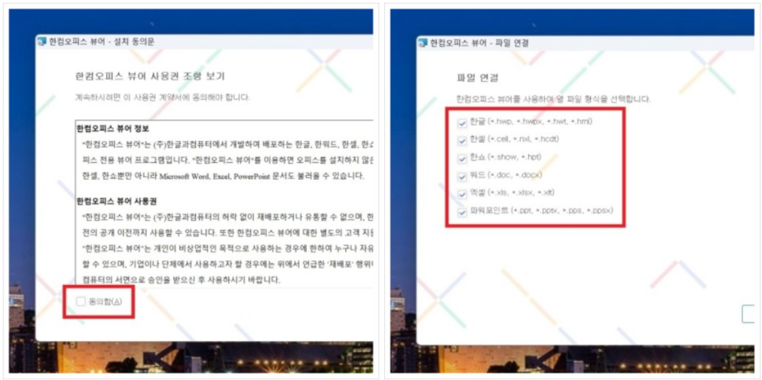 뷰어를 설치하고 사용하기 위한 이용약관은 시간이 된다면 한 번쯤 읽어 보는 것도 좋을 것 같다. 급한 분들은 바로 아래 있는 동의함 옵션을 찾아 체크를 한다. 그리고 연결할 파일 목록은 필요한 것들만 체크를 하면 되겠다. 어차피 설치할거 필자는 그냥 모든 옵션을 다 체크하고 파일 연결이 되도록 세팅 후 설치를 진행하였다.