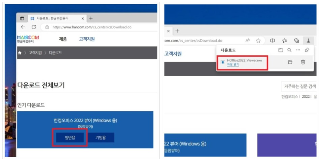 한글과컴퓨터에서 고객지원 서비스로 이동해 보도록 하겠다. 여기에서 뷰어 설치파일을 제공하고 있는데 일반용 버튼을 이용해 간단히 내려받을 수 있었다. 내려받기가 시작된 뷰어 설치파일을 찾아서 실행을 해보도록 하겠다. 웹 브라우저 다운로드 메뉴창이 보인다면 여기에서 다운로드가 끝난 직후 파일 열기를 선택해 실행을 하면 되겠다.