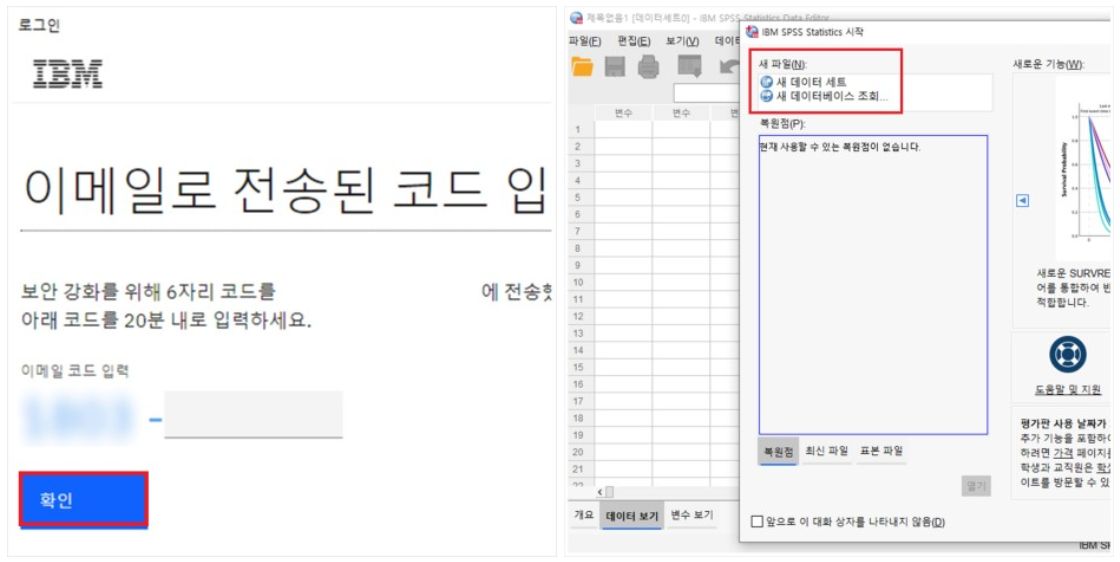 8. 정상적으로 프로그램 설치가 모두 완료 되었다면 이메일로 전송되는 6자리 보안코드를 한 번 더 입력하도록 합니다. 그리고 모든 인증 절차가 완료 되었다면 잠시 후 통계분석 프로그램인 spss 체험판 작동이 시작된 것을 확인할 수 있었습니다.