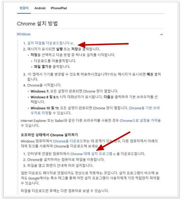 위쪽에 있는 설치파일이 인터넷이 연결된 경우 설치파일이고 아래쪽 [ 오프라인 상태에서 chrome 설치하기 ] 항목에 Chorme 대체 설치 프로그램을 클릭하면 크롬 오프라인 설치 파일 다운로드 가능합니다.