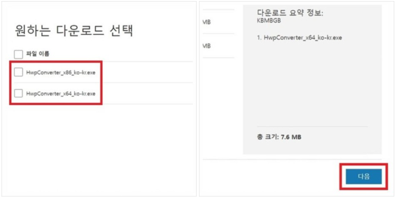 현재 사용 중인 윈도우 운영체제에 맞는걸 골라 다운로드 받도록 한다. 만약 64 비트를 사용하고 있다면 x64, 반대로 32비트를 사용하고 있다면 x86을 선택하면 된다. 한글파일 워드로 변환하는 프로그램 파일 용량은 7.6MB 정도로 매우 작다. 용량이 크지 않기 때문에 부담 없이 쓰기 좋았다. 아래 다음 버튼을 눌러보자.