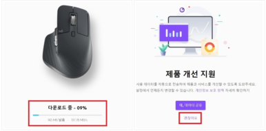잠시 후 Logitech 프로그램이 설치가 진행되는 것을 확인할 수 있다. 인터넷이 연결된 상태에서만 진행이 가능하며 용량이 크기 때문에 설치시간이 꽤 걸린다. 무사히 설치가 완료되었다면 제품 개선지원에 대한 안내사항을 확인할 수 있다. 데이터 공유를 원치 않을 경우 아래 괜찮아요 메뉴를 선택하면 되겠다.