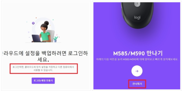 또한 로지텍 클라우드에 나의 설정을 백업하려면 로그인을 하면 된다. 로지텍 제품들을 사용할 때 다양한 서비스를 이용하기 위해서는 회원가입 후 계정을 하나 만들어 두는 것이 좋다. 누구나 쉽고 간편하게 가입 및 생성이 가능하다. 그리고 장치를 컴퓨터에 연결한 다음 조금만 기다리면 화면에 기기 외관이 표시될 것이다. 튜토리얼 화면은 건너뛰기를 선택해 넘어가도록 하자.