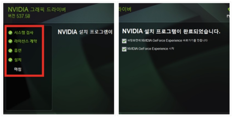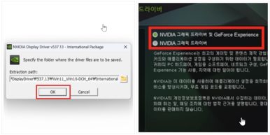 장착된 그래픽카드에 맞는 드라이버만 다운로드 받았다면 설치하는 방법은 어렵지 않다. 첨부파일을 다운받아 실행하면 설치마법사 창이 활성화된다. 여기에서 OK 버튼을 눌러 인스톨을 진행하면 된다. 화면 중간에 보이는 경로에 드라이버 설치가 시작된다. 잠시 후 새로운 창이 나타나면 NVIDIA 그래픽 드라이버 및 GeForce Experience 체크를 하자.