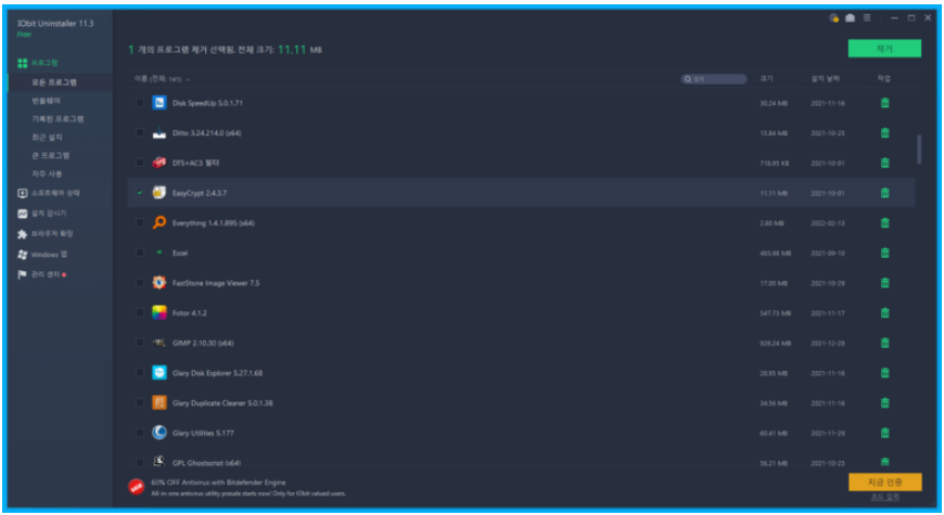 아이오빗 언인스톨러는 컴퓨터에 설치한 프로그램을 잔여파일까지 검색하여 완전삭제해주는 프로그램으로 사용하지 않는 프로그램, 인터넷 브라우저 확장 프로그램, 윈도우 기본 프로그램 등을 관리할 수 있는 기능을 제공합니다.