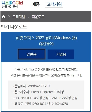 아래 링크된 한글과 컴퓨터 홈페이지에 접속해서 [고객지원] 메뉴를 선택하고 [다운로드] 항목을 눌러서 [인기 다운로드] 영역을 확인할 수 있습니다. 윈도우용 한컴오피스 2022 통합뷰어 프로그램을 다운받을 수 있는데요, 일반용과 기업용으로 구분되어 있습니다.