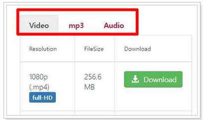 2. 탭에서 비디오 동영상 / mp3 / 오디오를 선택하고 다운로드를 클릭합니다.